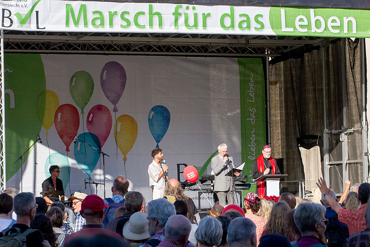 Das Grußwort des Apostolischen Nuntius Erzbischof Nikola Eterović trägt die Überschrift: „Noch ehe ich dich im Mutterleib formte, habe ich dich ausersehen“ (Jer 1,5). Er betont: „Jeder einzelne von uns ist nach Worten von Papst Benedikt XVI. „Frucht eines Gedankens Gottes. Jeder ist gewollt, jeder ist geliebt, jeder ist gebraucht“ (Predig zur Amtseinführung, Petersplatz, 24. April 2005). Diesen Gedanken greift der Heilige Vater Franziskus, den ich in der Bundesrepublik Deutschland vertrete, in seiner Enzyklika Laudato si‘ – Über die Sorge um das gemeinsame Haus vom 24. Mai 2015 auf und schreibt: „Die Bibel lehrt, dass jeder Mensch aus Liebe erschaffen wurde, als Abbild Gottes und ihm ähnlich (vgl. Gen 1,26). Diese Aussage macht uns die unermessliche Würde jedes Menschen deutlich; er ist nicht bloß etwas, sondern jemand“ (a.a.O., Nr. 65). … Im Namen des Bischofs von Rom und Hirten der Universalkirche grüße ich die Teilnehmerinnen und Teilnehmer beim 20. Marsch für das Leben, der zugleich in Berlin und in Köln stattfindet, und danke für das unermüdliche Engagement so vieler gerade für jene, die noch keine Stimme haben oder keine Stimme mehr erheben können, weil sie zu schwach geworden sind.“